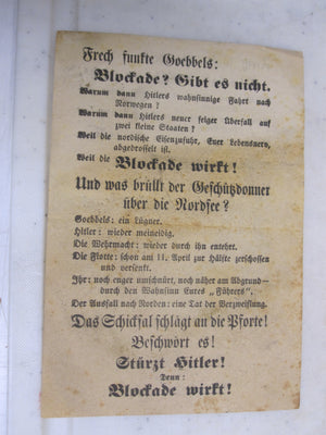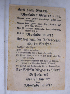 " Frech funkte Goebbels: Blockade ? Gibt es nicht. Warum dann Hitlers wahnsinnige Fahrt nach Norwegen ? ..... Weil die Blockade wirkt! Und was brüllt der Geschützdonner über die Nordsee ? .... Das Schicksal schlägt an die Pforte Beschwört es Stürzt Hitler ..... "
