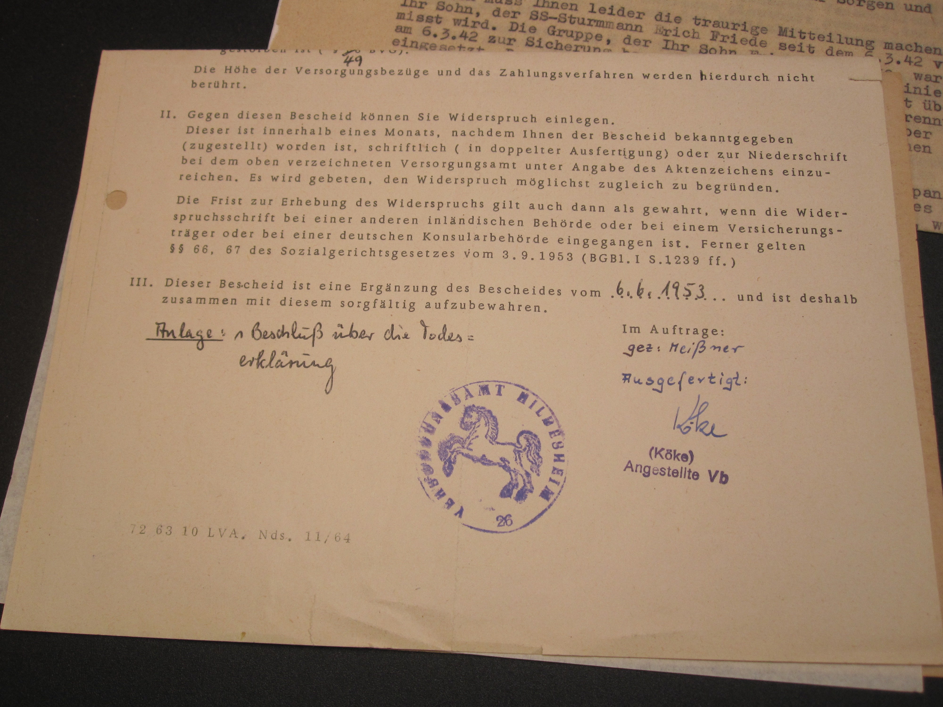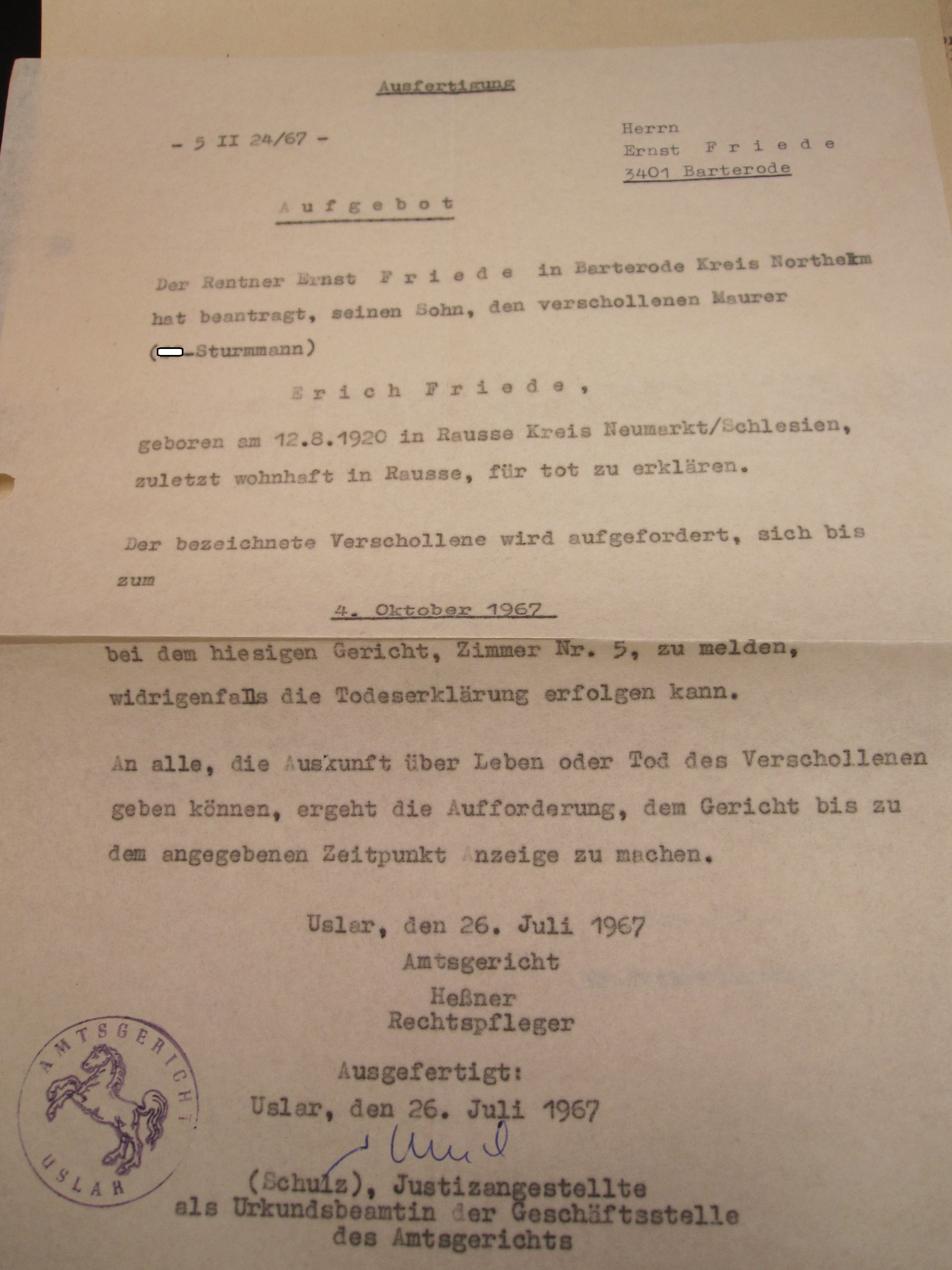 - Schreibenüber den Beschluss des Amtsgericht Uslar, dass der Maurer ( SS-Sturmmann) für Tod erklärt. Uslar 31. Oktober 1967