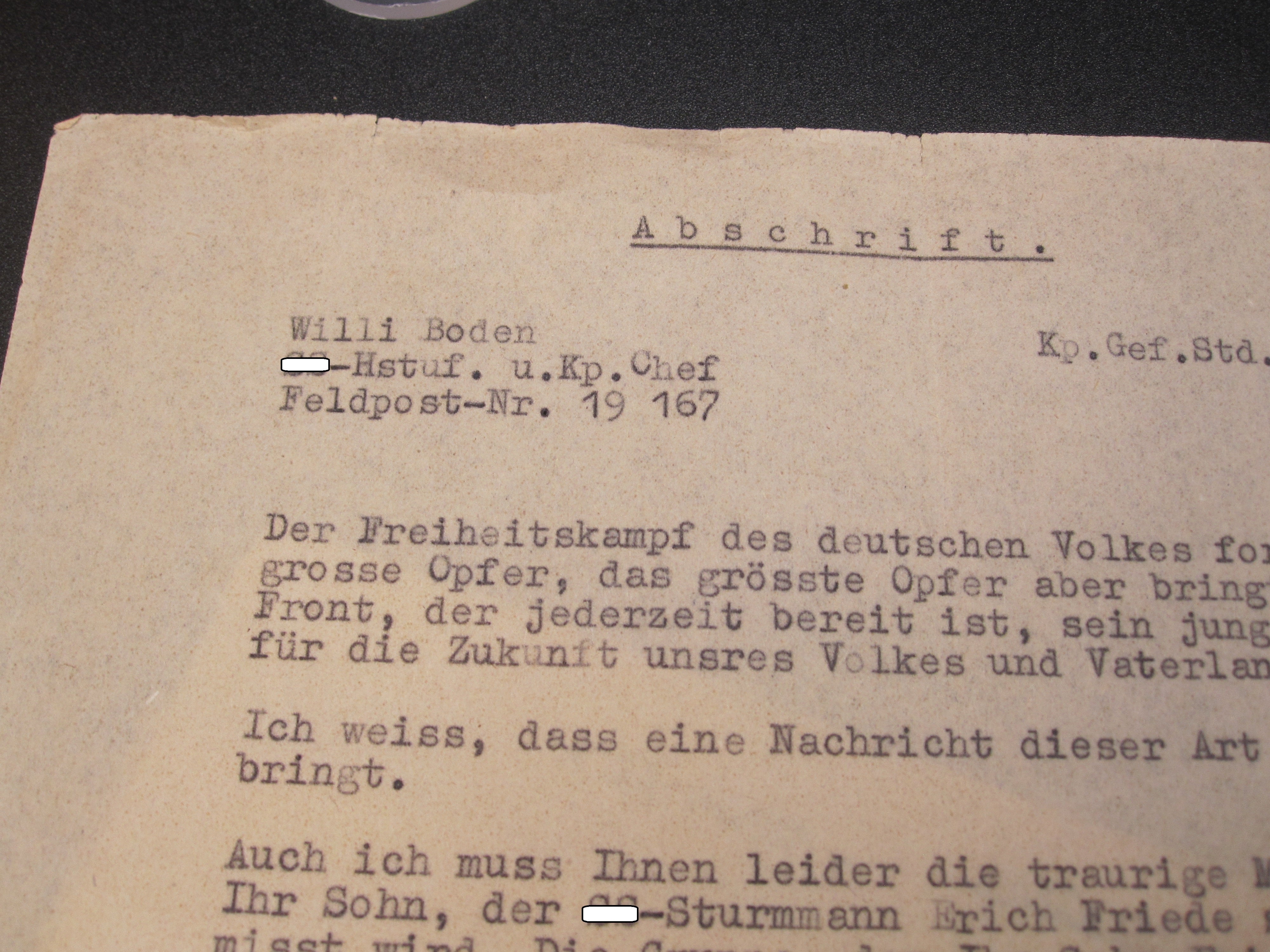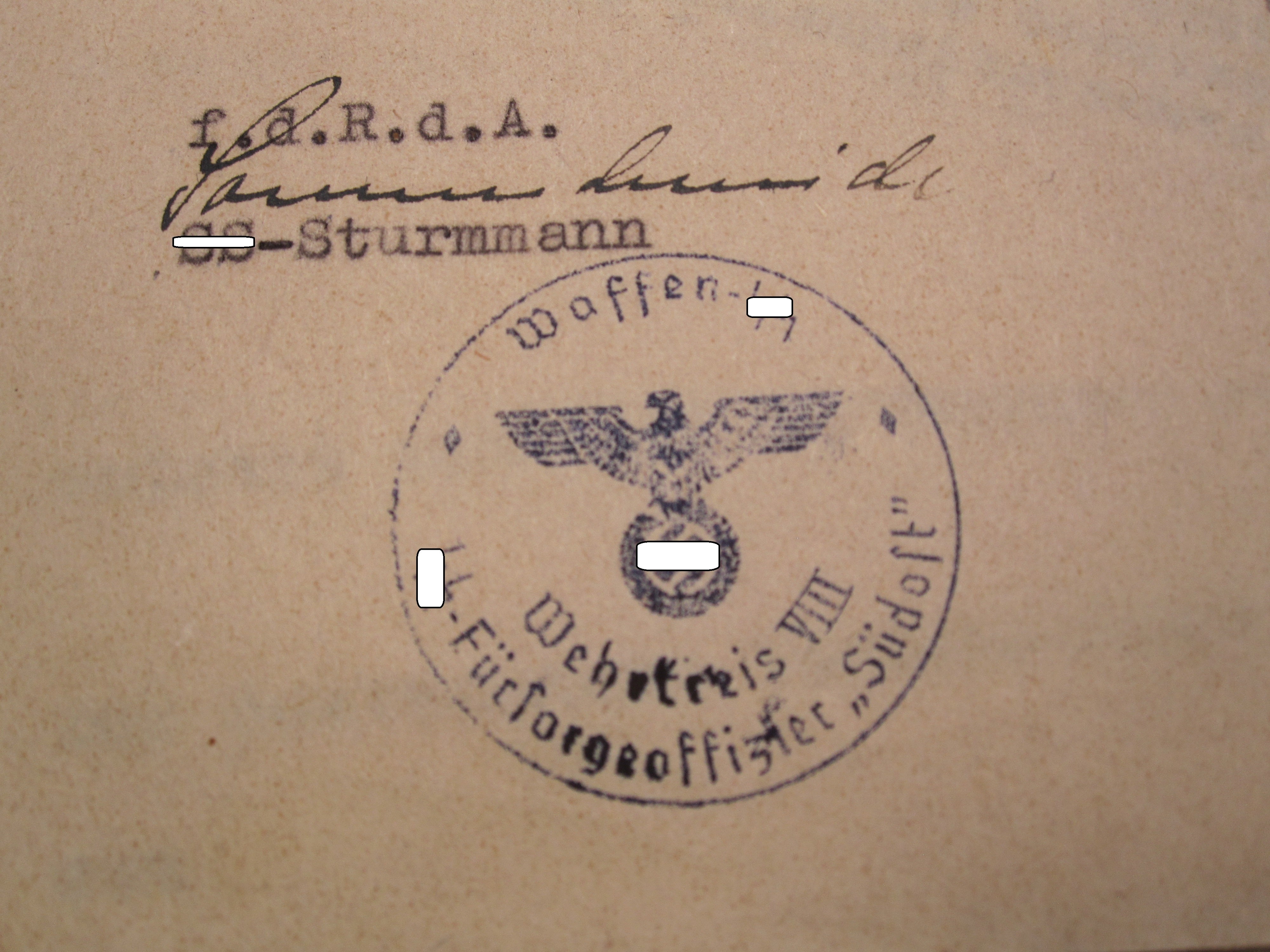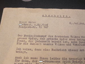 - Abschrift des Kompanie-Chefs & Hautsturmführer des Vermissten. Kompanie Gefechtsstand 16.3.1942 Stempel: Waffen - SS Wehrkreis VIII SS-Fürsorgeoffizier " Südost "
