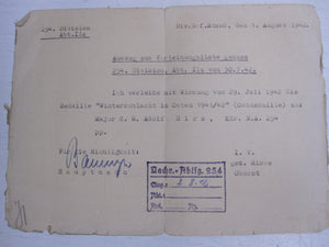 Auszug aus Verleihungslistegemäss 254. Division Abt. IIa vom 30.7.42 . Ich verleihe mit Wirkung vom 29. Juli 1942 die Medaille Winterschlacht im Osten 1941/42 (Ostmedaille) an Major d.R. Adolf Hirz Nachrichten Abteilung 254