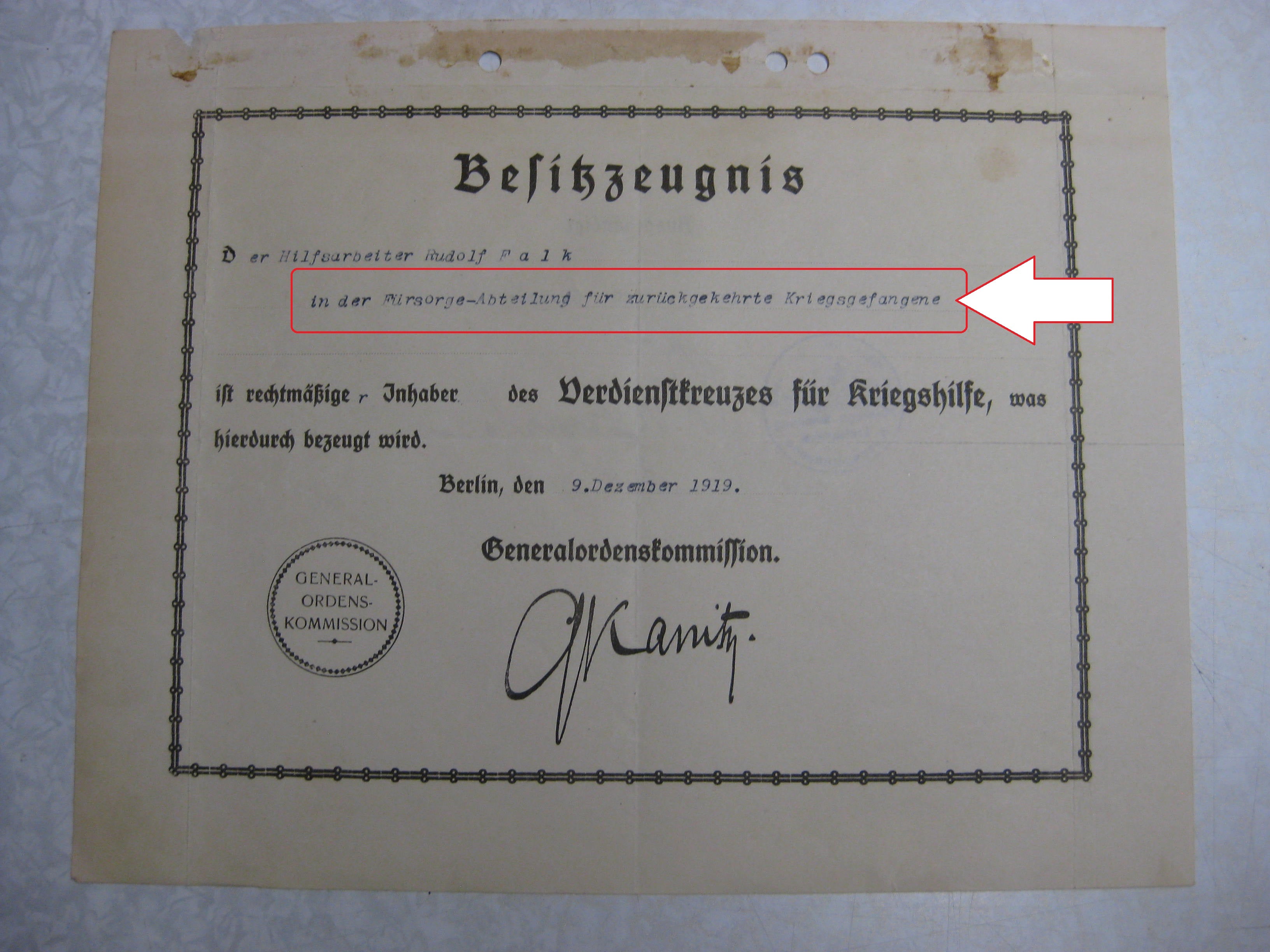 Deutschland Militaria Besitzzeugnis Kriegsgefangener Stalag Kreigshilfsdienstkreuz Ehrenzeichen deutscher deutsches Abzeichen 1. Weltkrieg 1.WK WW1